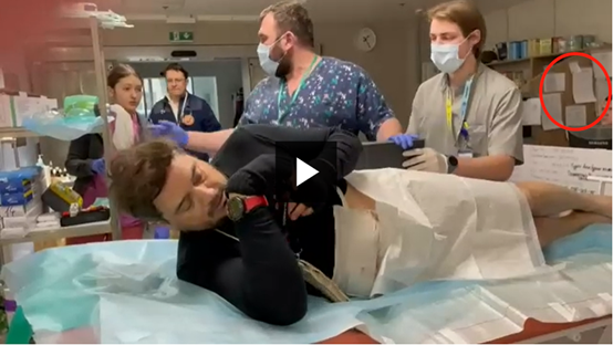 在这段运送阿雷东多的视频的第10秒至17秒,观众可以清楚地看到前一段视频中被医务人员遮挡的背景画面,包括货架及坐在桌前的工作人员。