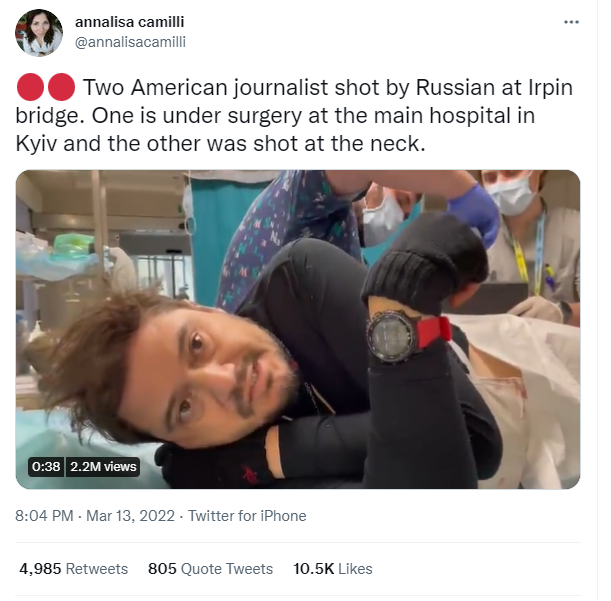 经核查,北京时间3月13日下午8时04分,卡米利确实在其个人推特账号上上传了一段视频,内容与网传视频无异。卡米利称,“两名美国记者在伊尔平桥被俄军击中,一名在基辅主医院得到救治,另一名的颈部被击中”。