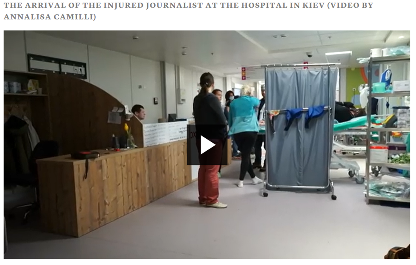 在Internazionale官网检索卡米利的名字,可以确认其身份为Internazionale的记者。3月14日,卡米利在Internazionale官网发表了题为《基辅附近两位美国记者受袭的故事》的文章,并在文中嵌入了两段以其名义发表的视频,其中一段正是其发布在推特上的采访视频,另一段则展示了受伤的阿雷东多被救护车运送至基辅Ohmatdyt 医院的画面。