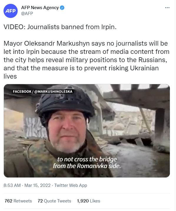 与此同时,卡米利的文章还提到,雷诺死后,伊尔平市长马库申(Oleksandr Markouchin)发布禁令,禁止媒体再靠近此地。法新社在3月15日亦对此消息进行了交叉印证,并发布了一段马库申出镜的视频,显示其呼吁媒体工作人员和乌克兰人不要再对士兵和军事设施进行拍照,以免将更多情报泄露给俄军。