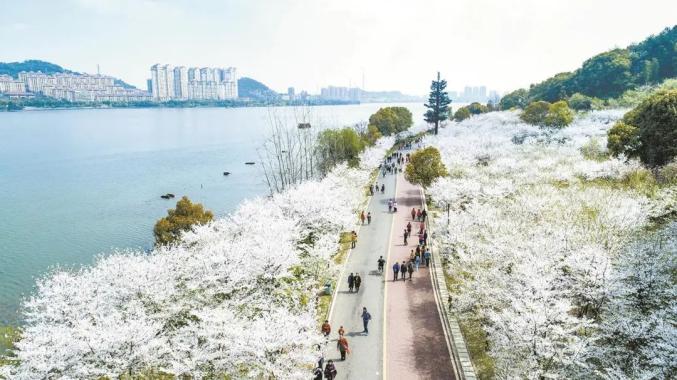 位于磁湖湖心岛的团城山公园,有多个品种樱花2000余株,形成2.5公里滨水樱花带。