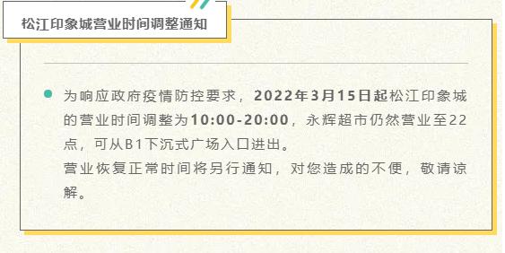 松江印象城说,为响应政府疫情防控要求,2022年3月15日起,松江印象城的营业时间调整为10:00-20:00,永辉超市仍然营业至22点,可从B1下沉式广场入口进出。详见↓