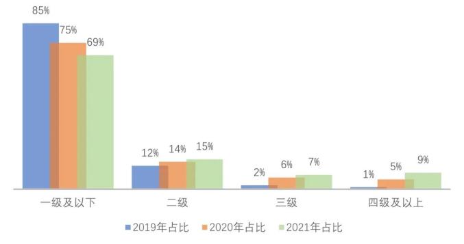 根据服务平台数据显示,目前我国69%的制造企业处于一级及以下水平,达到二级、三级的制造企业分别占比为15%以及7%,四级及以上制造企业占比达9%。2021年全国制造业智能制造能力成熟度较2020年有所提升,一级及以下的低成熟度企业占比减少6个百分点,三级以上的高成熟度企业数量增加了5个百分点。