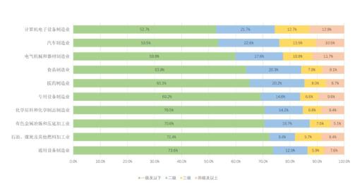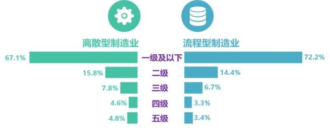 从行业来看,离散型制造业的成熟度水平整体高于流程型制造业。离散型制造企业一级及以下占比约为67.1%,低于流程型制造企业的72.2%,处于二级、三级的离散型制造企业占比较流程型制造企业高出2.5个百分点,处于四级及以上的离散型制造企业数量较流程型制造企业高出2.7个百分点。