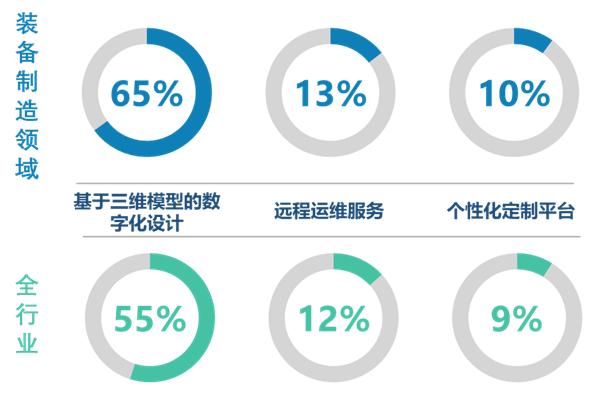 装备制造领域具有研发技术壁垒高、客户定制化需求多、售后运维成本高、上下游产业关联度高以及应用领域广泛等特点。根据平台数据分析结果显示,装备制造业65%的企业开展了基于三维模型的数字化设计,13%的企业提供了产品的远程运维服务,10%的企业建立了产品的个性化定制平台。