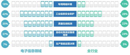 2、电子信息领域电子信息领域对装备自动化程度要求偏高,对质量过程管控严格,具有信息系统覆盖广泛、生产运营管理高效等特点。根据平台数据分析结果显示,电子信息产业中18%的企业搭建了专用网络环境,42%的企业实现工业信息安全防护,35%的企业在质量检测环节应用了在线检测平台,37%的企业应用了自动化物流设备,7%的企业实现了生产智能运营决策。