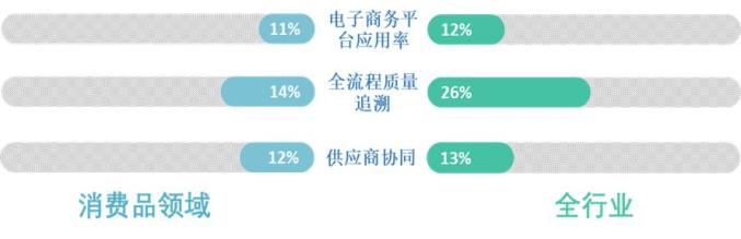 4、消费品领域消费品工业对质量控制要求严格、对供应链稳定需求迫切,具备丰富的市场营销渠道。根据平台数据分析结果显示,消费品工业中电子商务平台应用率为11%,全流程质量追溯实现率达14%,12%的企业实现供应链协同。