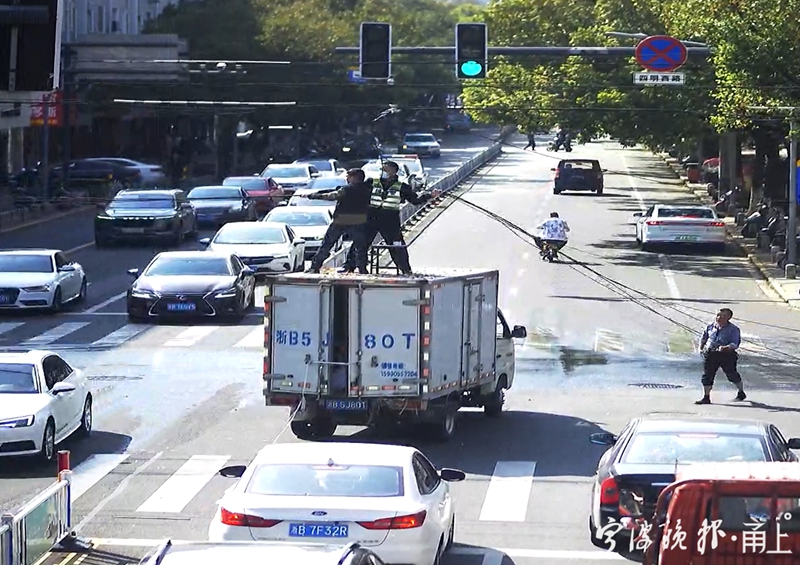 3月13日下午2点左右,一辆大型喷雾抑尘车在经过宁波余姚四明西路与大黄桥南路路口时,不慎将空中的通信光纤线刮倒在地,瞬间引起了道路拥堵,排队车辆超过百米。紧急关头,巡逻的交警铁骑与数位热心市民共同上前,在滚滚车流中“托举”出了一条安全通道。
