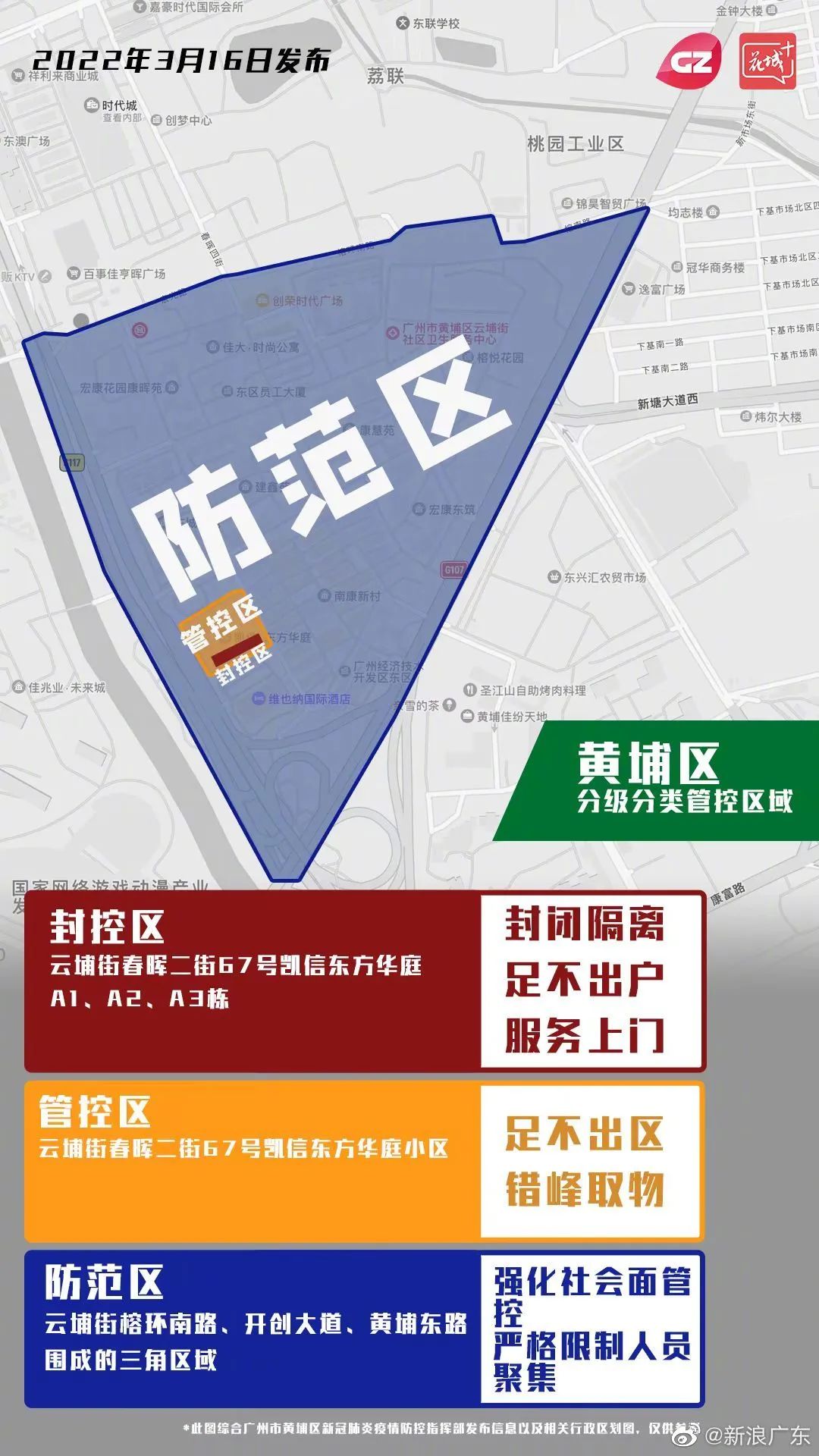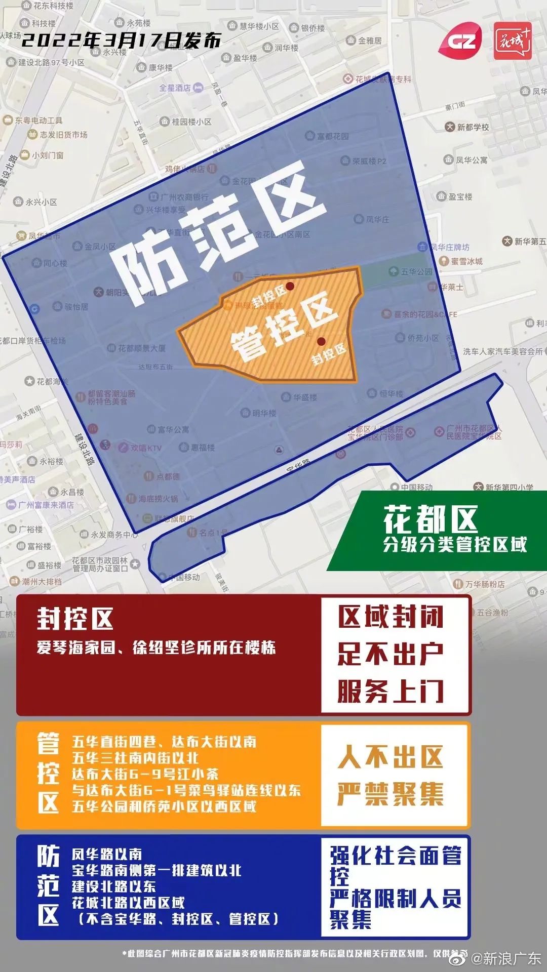 根据疫情防控工作需要,自2022年3月17日起,将花都区新华街道辖内风险区域划分封控区、管控区、防范区(详见附图),落实相应管控措施: