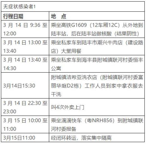 3月16日,我市海丰县、陆丰市分别报告1例新冠肺炎无症状感染者,在密切接触者集中隔离期间核酸检测初筛阳性,后送汕尾市疾控中心复核阳性,综合流行病学调查、临床表现、实验室检测等,经专家组会诊,诊断为新冠肺炎无症状感染者。目前已转运至定点医院隔离治疗,情况稳定。我市第一时间启动应急处置机制,立即开展流行病学调查、相关人员排查、采样检测、重点场所管控及环境消毒等防控工作。现将行动轨迹公布如下: