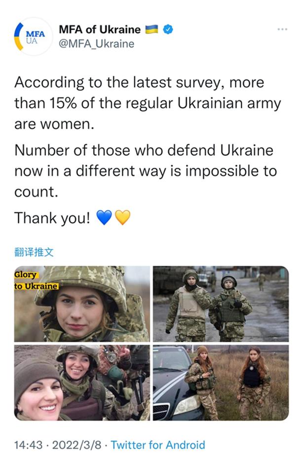 更要命的是,有关乌克兰前线军人的宣传内容,还经常被各国网民发现这些军人佩戴了纳粹符号。今年3月8日妇女节当天,北约就曾引用了一张佩戴纳粹“黑太阳”标志的乌克兰女兵照片,但在不久后删除。而乌克兰外交部的官方账号的同类推文,更是在发布了同样佩戴纳粹符号的女兵的照片,且一直对评论区网民指出这一问题的留言视而不见。