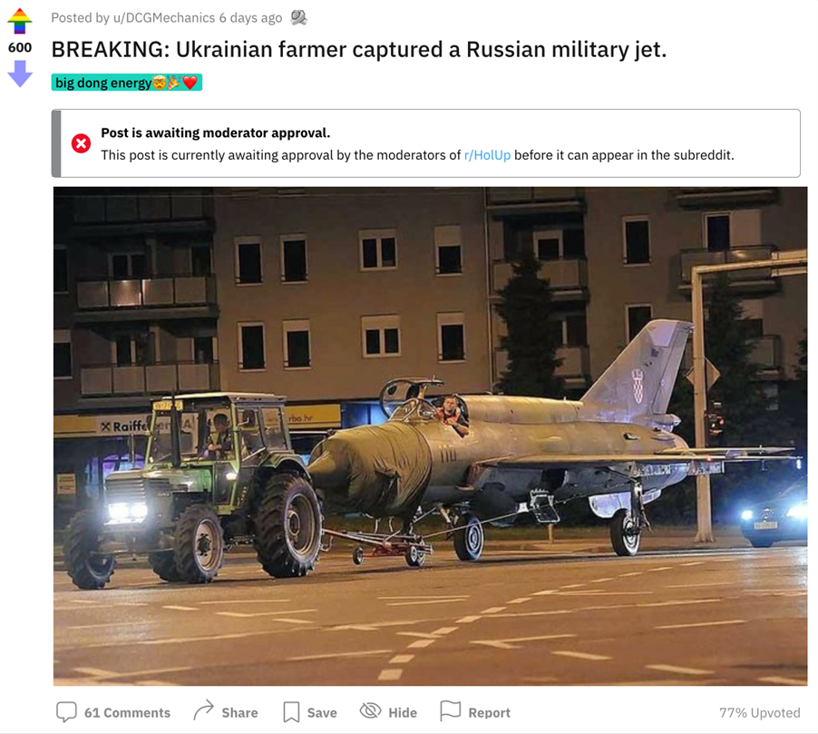 前些日子,有网友在Reddit论坛上发帖,称“乌克兰农民捕获了一架俄罗斯战机”。配图中,一架拖拉机拉着一架军绿色的战机在大街上行驶。