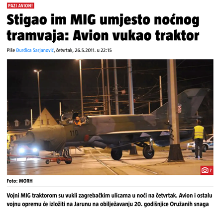 在谷歌中对上述图片进行反搜可知,图中事件的确发生于克罗地亚。2011年,正值克罗地亚武装部队成立20周年,在首都萨格勒布的Jarun举行庆典。克罗迪亚当地媒体24sata.hr报道了这一事件。据称,一辆拖拉机拖着一架克军的米格战斗机穿过首都的大街,要将这架米格运往Jarun进行展示。故网传拖拉机“俘虏”俄军战斗机的图片具有误导性。