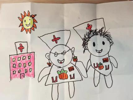 后来等她不那么疼的时候,她就画下了这幅画像,“谢谢南瓜姐姐在我难受的时候一直陪着我,南瓜姐姐一个人会孤单,所以我又画了个南瓜哥哥。”