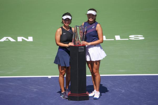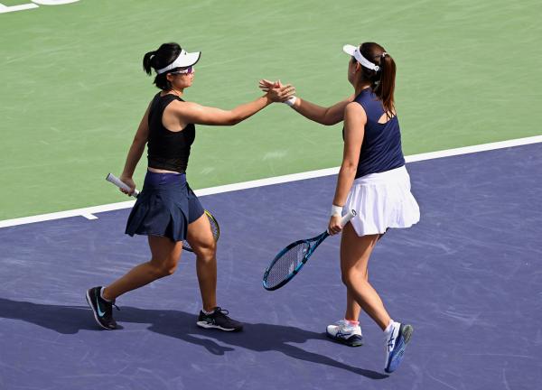 以一记网前截击拿下赛点的徐一璠扔掉球拍,杨钊煊从后场跑来和搭档拥抱,庆祝她们以非种子球员身份夺得2022赛季印第安威尔斯公开赛冠军。