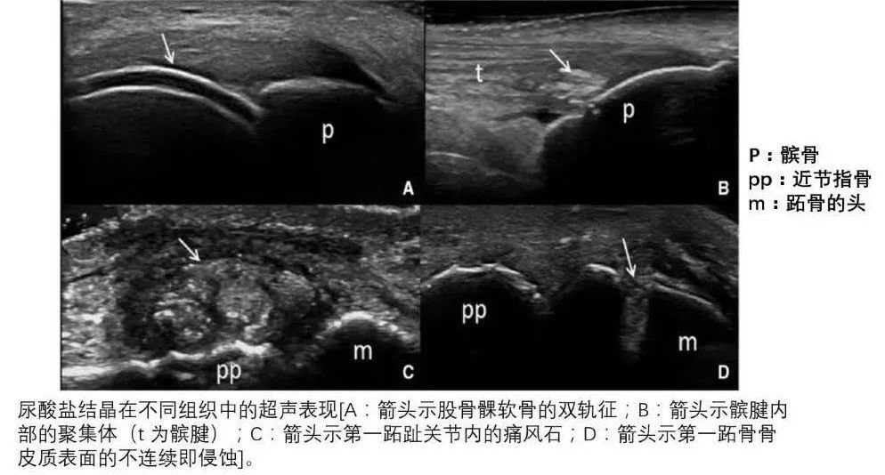 痛风性关节病变,超声表现为关节滑膜增厚,尿酸盐可沉积于关节软骨、滑膜、关节周围肌腱或软组织,表现出相应的特征性超声图像。超声也可观察关节腔积液或受累滑膜软组织的血流情况,间接评估炎症状态。