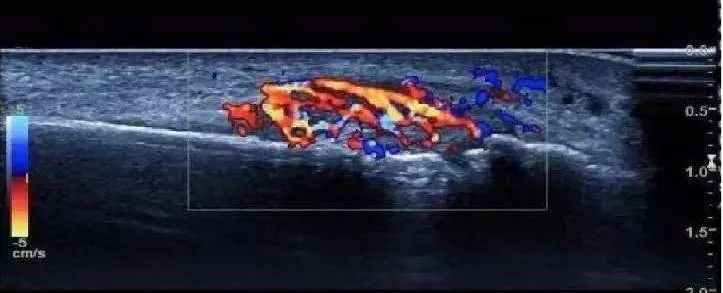 通过超声也可判断是否处于痛风急性期:痛风急性期发作时,增厚滑膜上可见丰富血流信号。
