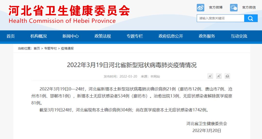 2022年3月19日0—24时,河北省新增本土新型冠状病毒肺炎确诊病例21例(廊坊市12例、唐山市7例、沧州市1例、邯郸市1例),新增本土无症状感染者534例(廊坊市)。治愈出院13例,无症状感染者解除医学观察81例。截至3月19日24时,河北省现有本土确诊病例304例;尚在医学观察本土无症状感染者1742例。