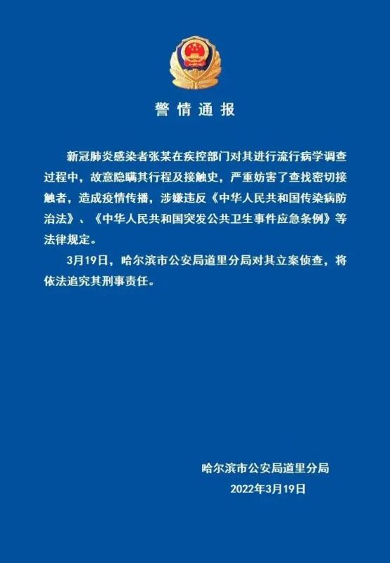 哈尔滨新增63例阳性轨迹公布丨感染者张某,被立案侦查