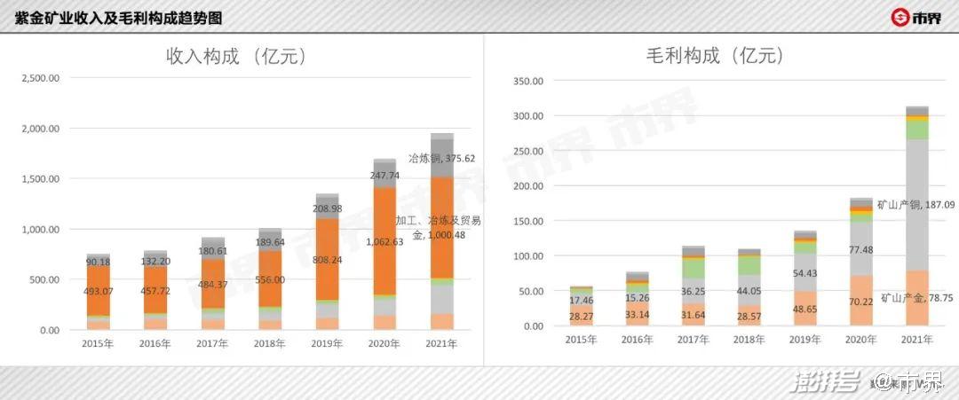 原因在于,贡献收入更多的冶炼业务,赚的是“加工费”,毛利率不到1%;而矿产金和矿产铜业务,属于开采环节,也是金属产业链上受金属价格影响最大的环节,毛利率可达30%至69%。