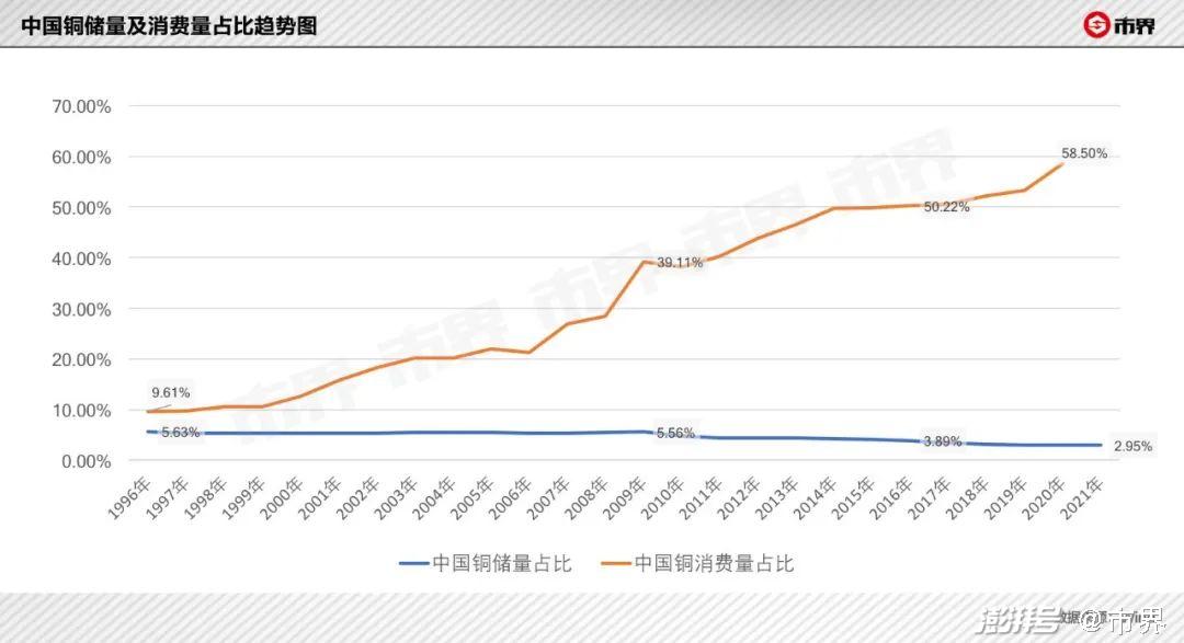 一个值得关注的问题是,全球范围内,中国已然成为对铜需求量居首的第一消费大国,2016年以来每年都要消耗全球一半以上的铜,但中国铜储量占全球铜储量的比例却始终处于低位,2021年更是降低至2.95%。