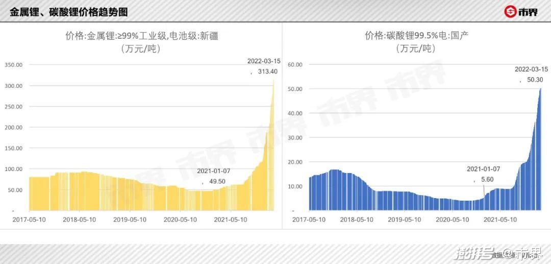 伴随新能源产业对锂资源需求的大幅增长,金属锂价格从2021年初的49.5万元/吨涨至2022年3月15日的313万元/吨,碳酸锂价格则从同期的5.6万元/吨涨至50.3万元/吨。