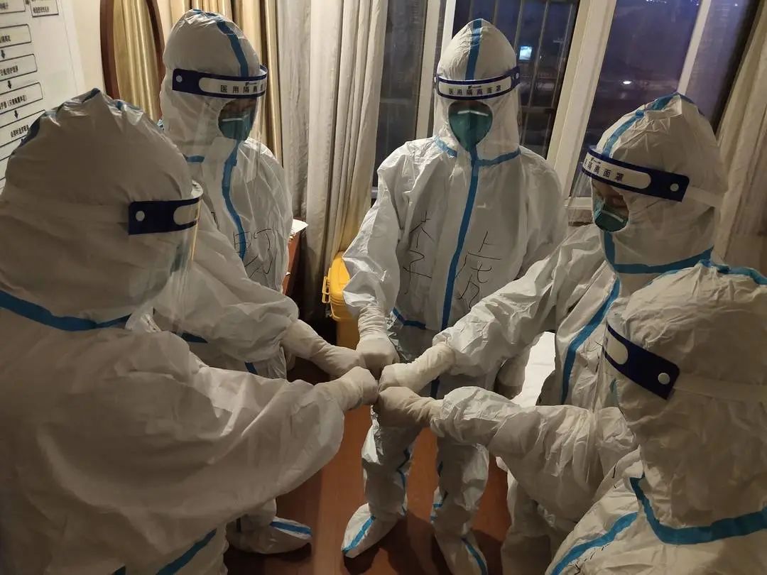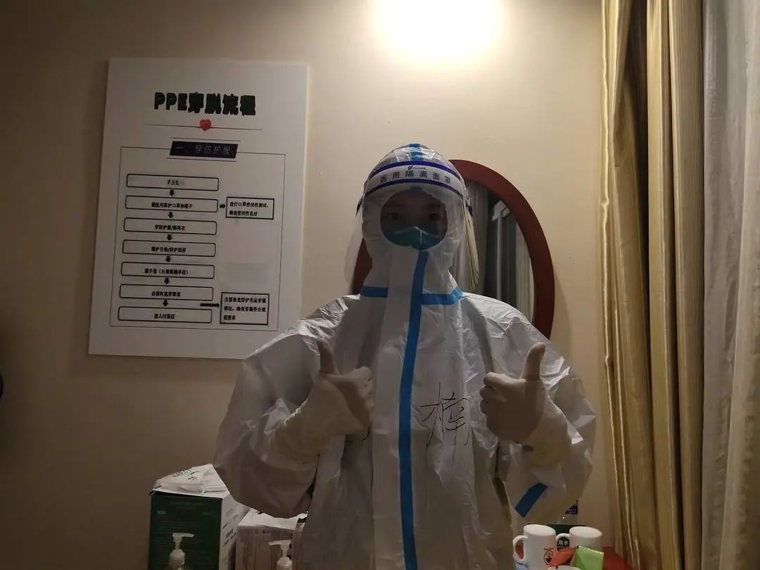 刘楠教小伙伴正确穿脱防护服隔离点的工作忙碌而又繁琐。队员们每天清晨5点多钟就要起床,清理隔离人员产生的生活垃圾、安排一日三餐、做报表、进行核酸检测,还要负责迎接新的隔离人员、送走结束隔离的人员,忙到晚上九十点钟是常态,夜间也会随时接到新的任务。3月中旬有几天气温偏高,他们穿着防护服,一两个小时就浑身湿透。