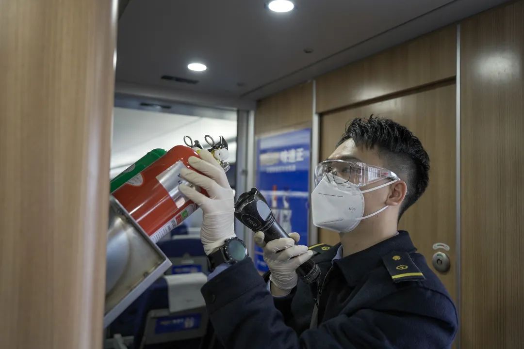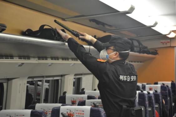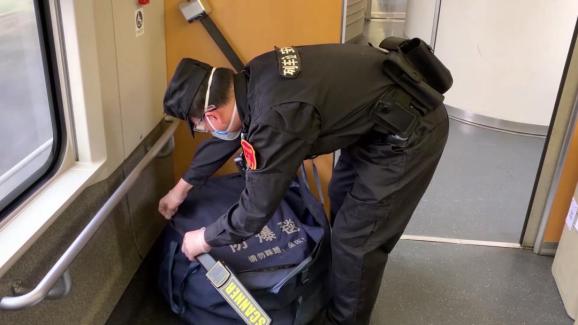 终到后✦列车长开启巡检仪对全列进行检查,安全员协助检查行李架上是否存在旅客遗失物品,发现后按规定交车站。