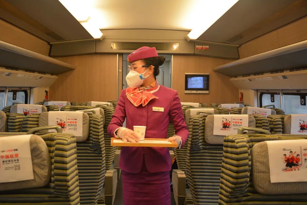 承担服务旅客的职责。以8辆编组动车组为例,共配备4名乘务员(含1名餐服员、1名餐服长)。一员负责1至4号车厢,另一员负责6至8号车厢。
