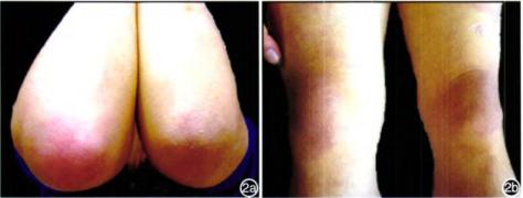 Gottron征:若上述部位仅见红色、暗紫红色斑片或萎缩性斑疹时称Gottron征。(图2)