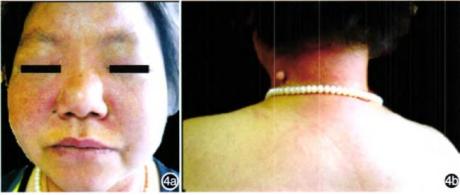 图3 Heliotrope征[3]曝光部位皮肤红斑:见于头皮、面部、耳部、颈部、上胸部、肩部等,皮肤损害表现为弥漫性紫红斑(图4)。