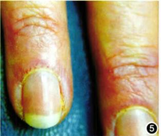图5披肩征[2]甲周改变:包括甲周毛细血管扩张、扭曲,甲周红肿、瘀点、触痛,甲小皮粗糙增厚,边不规则、皲裂等。DM患者甲周毛细血管扩张(图6)常提示疾病活动,虽无肌肉等症状亦需系统性治疗。