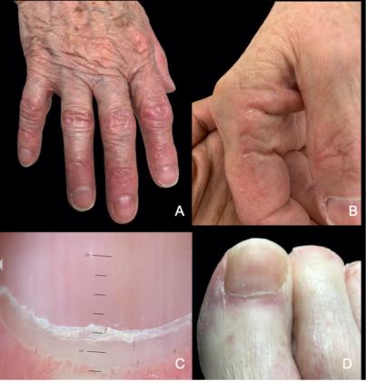 实验室检查:甲襞、指间关节(图7A、D)和双侧手掌出现明显红斑和剥落,并伴有角化样改变,拇指内侧和食指外侧出现脱皮皮疹(技工手)(图7B),近端甲襞的皮肤镜检查显示毛细血管扩张(图7C)。抗核抗体滴度为1:80,肌酸激酶在正常范围内。