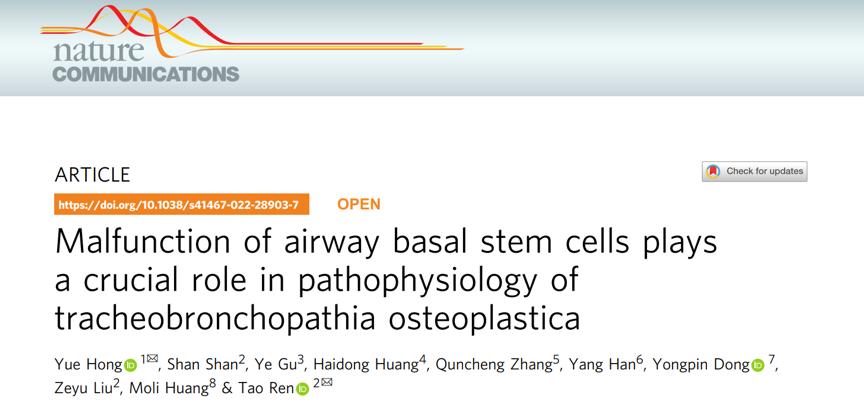 2022年3月14日,我院呼吸内科主任任涛教授及洪玥研究员领衔的研究团队在Nature Communications杂志上在线发表题为“Malfunction of Airway Basal Stem Cells plays a crucial role in Pathophysiology of Tracheobronchopathia Osteoplastica”的研究论文,从成体组织干细胞的角度第一次细致解析了TO的发病机制,首次报道TO患者的气道基底细胞(Tracheal-bronchial basal cells, TBBC)存在功能异常,从而揭开骨化性气管支气管病病症的神秘面纱。