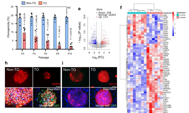 任涛教授团队首先借助独创的PStem干细胞体外培养平台对TO患者病灶区组织进行基底干细胞分离、扩增以及功能评估,发现患者BCs的自我更新(self-renewal)能力明显低下,纤毛上皮分化能力被抑制并伴随显著的鳞状细胞化生趋势,结果提示TO病变与基底干细胞功能改变有关。本研究方法与传统的组织解离结合单细胞测序研究策略不同,以离体稳定培养后的干细胞克隆为研究对象进行干细胞状态评估,能更好地捕捉到病态下细胞发生的长期记忆性改变或客观存在于机体的异质细胞亚群,并尽可能剔除细胞过渡性状态或反应性瞬时改变等干扰。