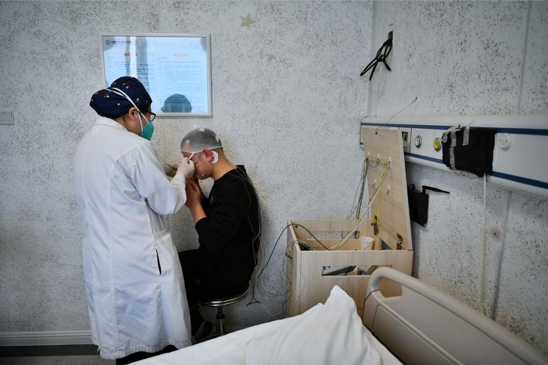 对患者皮肤进行擦拭后,李丽君捋顺导线,拎出一根,托起末端连接的电极杯说:“它像一个迷你小勺,我会像挖冰激凌球一样挖一勺电极膏,用胶布固定在患者头顶。”很快,分布于头部、面部、腿部的20余根导线依次就位。