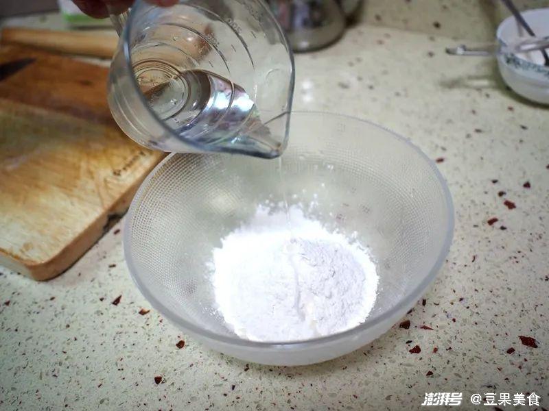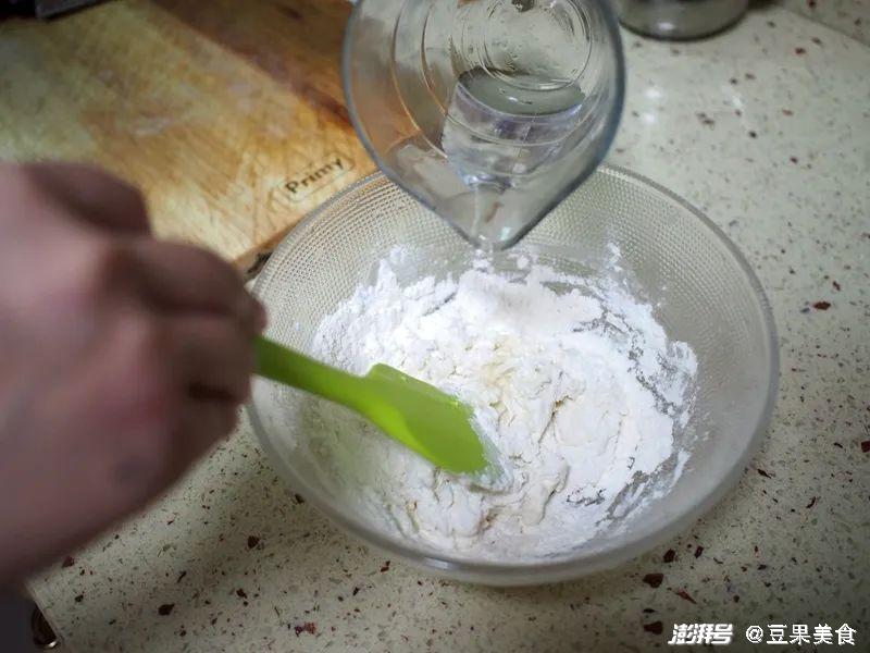 2.一边倒水一边用刮刀搅拌成雪花状,面越软越好,是软不是稀,稀了加面粉,硬了加水,反复使劲揉搓