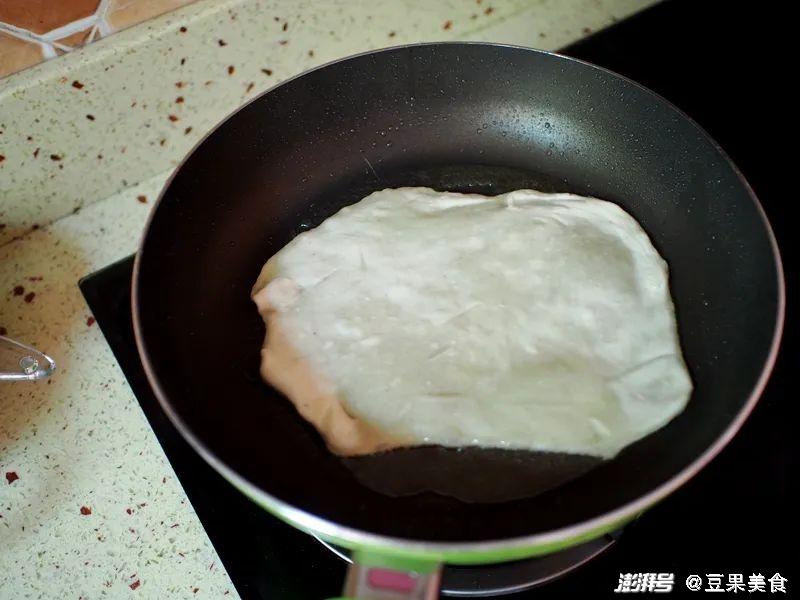 12. 锅预热后,倒入植物油,加热至产生油纹,再调小火力,等待一会儿,放入饼皮;