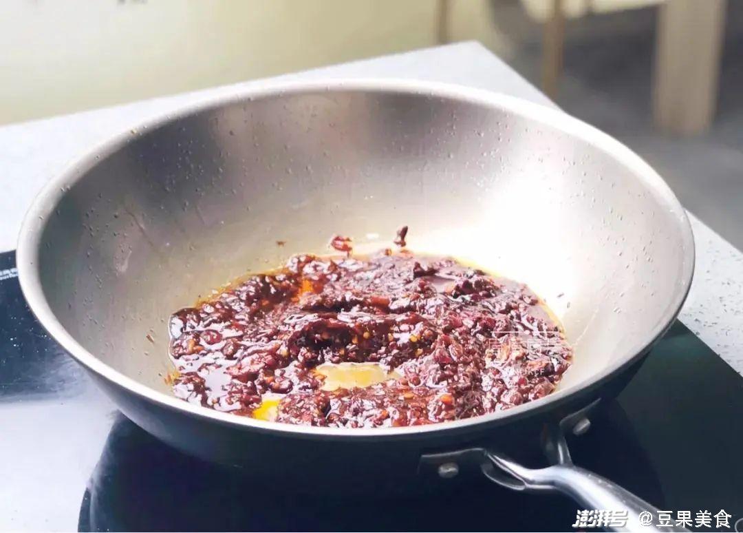 4.趁着醒面的时候开始做酱料:冷锅冷油,直接下八角、花椒,小火翻炒炸出香味,捞出只留油,放蒜末爆香后加葱花,再把豆瓣酱、甜面酱、蒜蓉辣酱放入锅里,小火翻炒出香味,加小半碗水中火煮开转小火,煮到酱料稍微粘稠即可,装碗备用