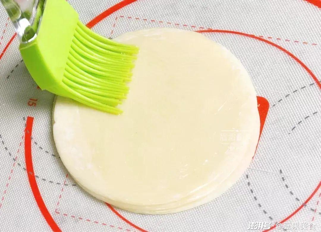 4.铺上一张饺子皮,刷上一层植物油;