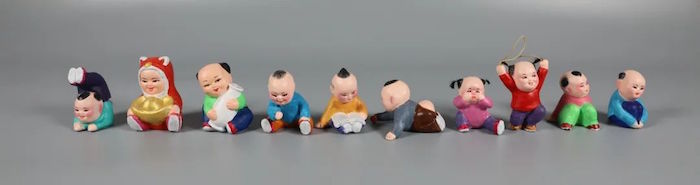 该作品塑婴孩形象一组二十个,身着彩衣,神态各异,或立、或坐、或躺,或面带微笑,或故作沉思。其中三娃各抱元宝、宝瓶、如意一只,象征着福禄寿。明清时期,泥娃娃常作为玩具,颇受时人喜爱,为苏州泥塑“耍货”中的经典形象。