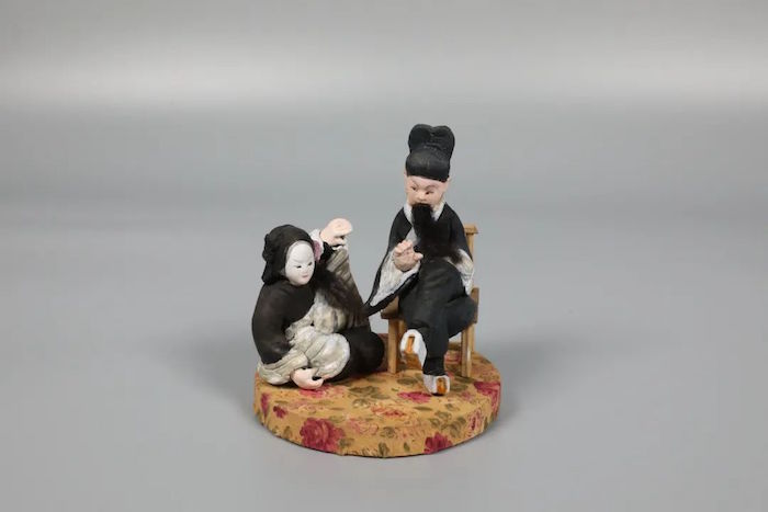 作品根据苏州博物馆藏近代沈万丰手捏戏文《牧羊卷》复制,表现的是朱春登立下战功、封侯归省,寻得遭人陷害、在外乞讨的赵锦堂婆媳二人,辨明冤屈,最终骨肉团圆的故事,极为精致生动。生角朱春登头戴黑三髯,服着玄色褶子,脚穿厚底靴,坐在椅子上双腿交叉搭在一起,手中似乎在比划着什么,眼神注视着对方似乎在询问和倾听。而旦角朱妻赵锦堂眼睛直视朱春登呈四目相对状态,她身着玄色衣裳,腰系白色丝带,一手撑地一手捏着裙角蹲坐在地上,表现出哀婉羞涩、惶恐不安的神态,人物造型高低对比,动静结合地再现了戏文情景。