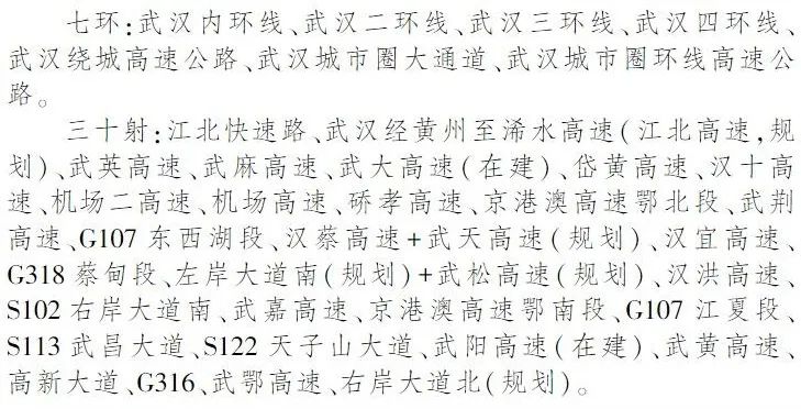 谋划形成以武汉为中心、辐射城市圈的“七环三十射”高快速路网络,实现武汉至周边城市的直联直通直达。