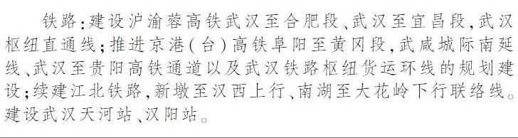 规划研究武汉—红安连接线、武汉—罗田—英山—安庆高铁、武汉—黄石—九江高铁新通道,争取在武汉东西主轴、南北主轴及长江中游城市群间逐步建成客运双通道。
