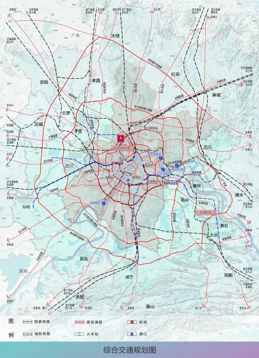规划建设武汉站—武汉天河机场、桃桥湖—邾城及武汉至孝感、鄂州等周边地区市域(郊)铁路。