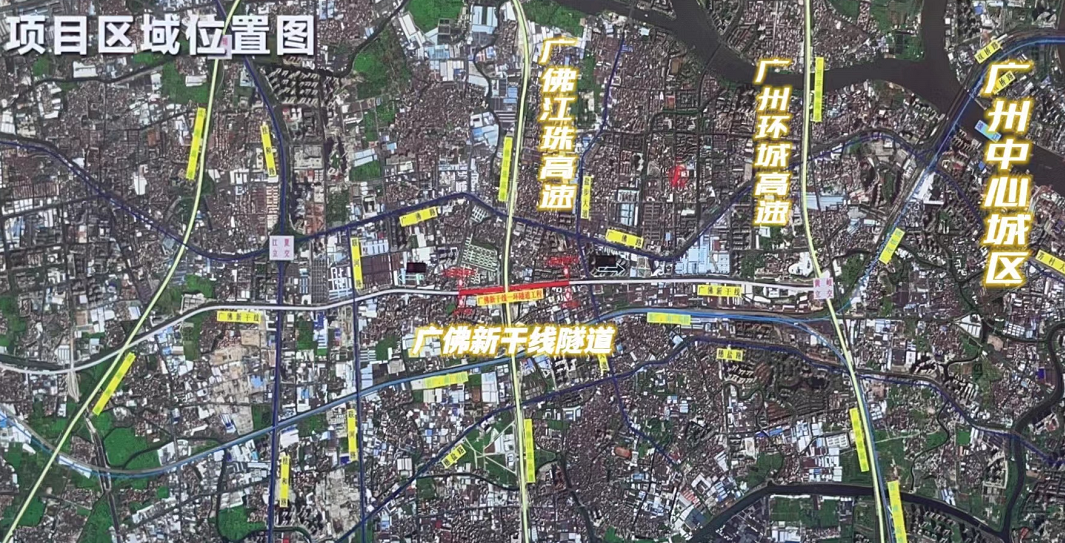 广佛新干线佛山一环隧道工程主线起点:位于广佛江珠高速(原佛山一环)与广佛新干线交叉口以西约520米处,下穿广佛江珠高速(原佛山一环)跨线桥向东延伸。