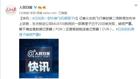 记者从东航飞行事故第二场新闻发布会上获悉,东方航空公司MU5735航班的一部黑匣子已于23日被发现,破损严重。暂不确定是数据记录器(FDR)还是驾驶舱话音记录器(CVR)。