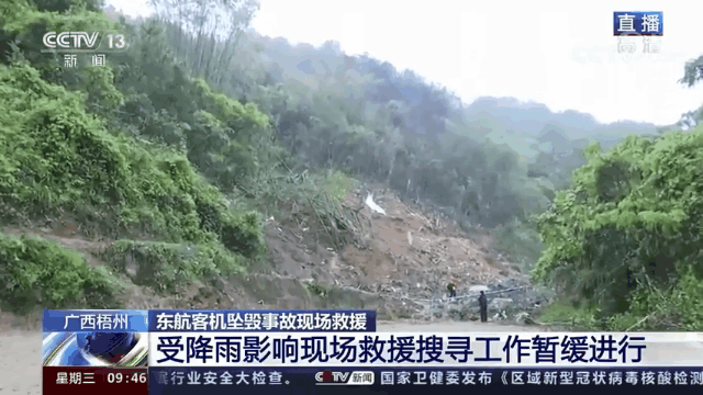 今天凌晨开始,东航客机坠毁事故救援现场下起了雨,由于当地土壤吸水量大,现场存在小规模滑坡可能,为救援增加不确定性,大面积搜救工作暂缓。