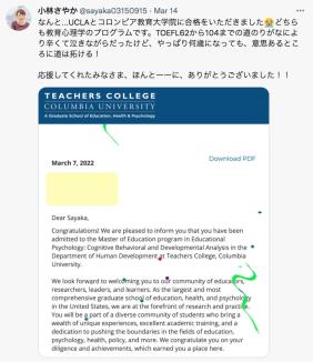 34岁的她,最终被UCLA和哥大教育研究生院同时录取。她在推特上发贴称,“在34岁时留学梦成真,有点难以想象。果然,不管到了多少岁,有志者事竟成。”