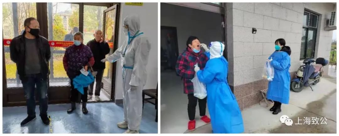 在乡镇机关工作的陈红、刘宇轶、胡博炜(上左图右一)等党员,以及刚刚加入致公党的王丹凤(上右图右一)、朱婕妤,都担任起了所在乡镇全员核酸检测志愿者,每天到各村居、甚至深入村民家中协助医务人员操作PDA采集信息,帮助老年人做好核酸检测登记。